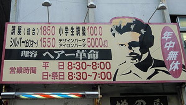 はさみを持った右腕が振り子のように動く仕組みの看板は他にも見た事があるが、別人だった気がするのでカスタムオーダーが可能なのだろう(写真が見つからなかった)。日が暮れた人気の無い通りでおぼろげに光り、誰へとなく腕をふり続けていた姿に少しギョッとしたのを覚えている。