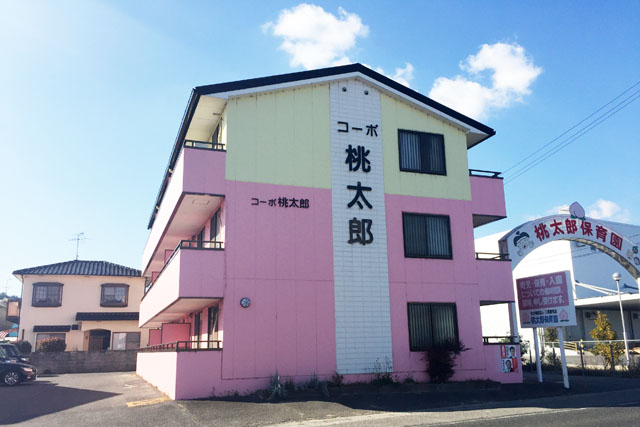 外壁はピンクで桃太郎の名を冠するに相応しい。