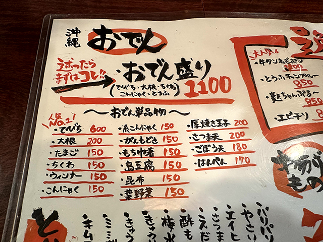 もちろん、沖縄おでんに欠かせない「テビチ」「チマグ」「葉野菜」がある。「とうもろこし」「アーサさつまあげ」「もずくさつまあげ」は、なかなか他店では見ない珍しい具材ではないだろうか。そして夜の部にも「沖縄そば」がある。