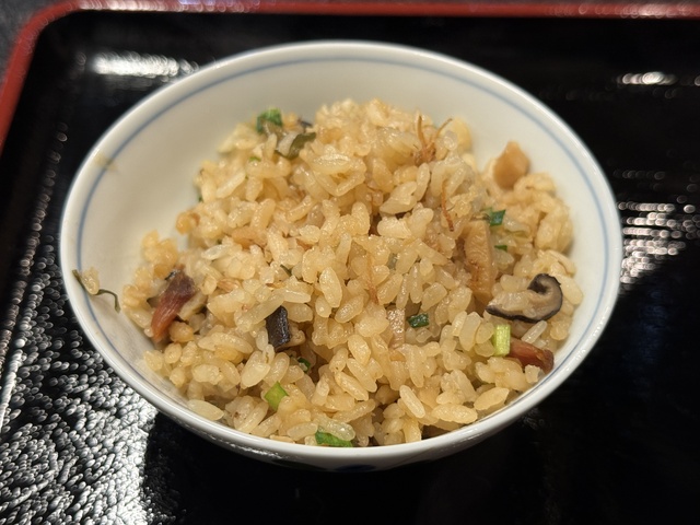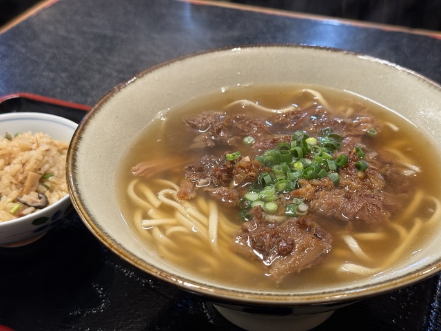 セットのジューシー。沖縄そばがこってりなのに対し、こちらはシイタケのダシがきいたあっさりとした味わいでバランスがよい。
