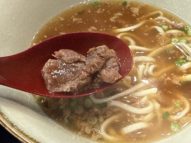沖縄そばのダシは店によってカツオダシや豚ダシ、鶏ガラ、数種類のあわせダシなどのバリエーションがあるが、このタイプは初めて食べた。旨味の厚さよ。
