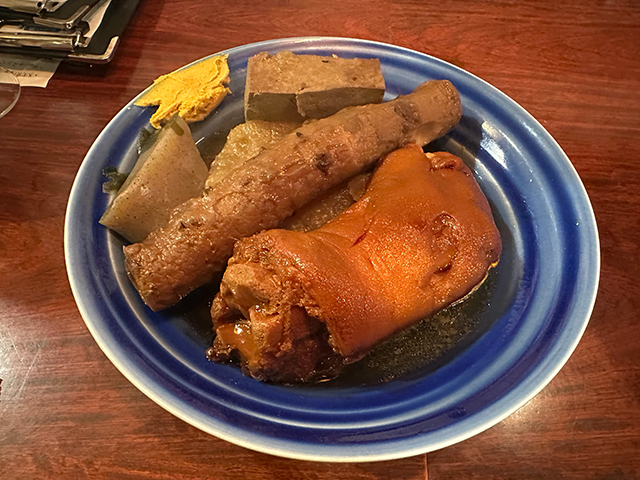 こちらが「あだん」のおでん盛り。わりと色の濃いダシで、しっかりと具材が色づいている。テビチにしっかり味がついていてうまい。