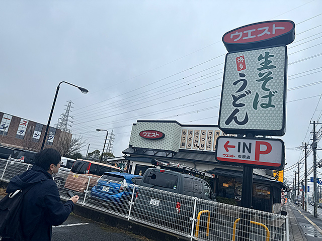 駅から離れる程に交通量が増えていく道を15分ほど歩いて、雨がようやく霧雨になった頃にボートピア市原へと到着した。ここで一勝負と行く前に、まずは腹ごしらえをする。目的地をボートピア市原にした理由は、すぐ近くに「生そばウエスト市原店」があったからでもあるのだ。