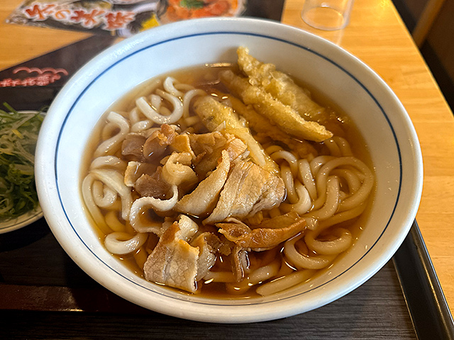 私がそばを頼むとついつい3玉にしてしまって、食べ終わってから苦しむ未来しか見えないので、豚肉特うどんの普通サイズにした。ギャンブルは満腹でするものではないという自制心が働いてくれた。