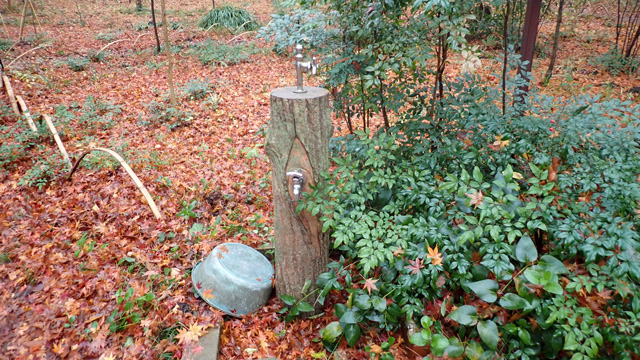 雨で湿った落ち葉の匂いが漂う十枝の森で静かに佇んでいる擬木の水飲み場。森とけなげに同化しようとする擬木にグッとくる。