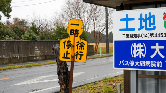 道路の反対側から「あれ、なんですかねえ」となって見に行くほど我々にインパクトを与えた看板である。勢いよく駆け出す幼児の形のはよく見るが、バストアップの壮年男性(たぶん)という静的な佇まいでくるとは。一時停止コンシェルジュという感じだ。