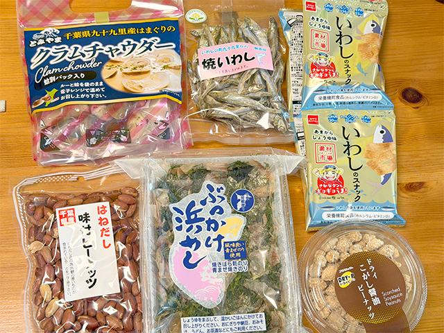 べつやくが自由に買った土産です。左上から、九十九里産はまぐりのクラムチャウダー、九十九里の焼いわし、いわしのスナック、千葉県産はねだし味付ピーナッツ、ぶっかけ浜めし、ドライこがし醤油ピーナッツ。