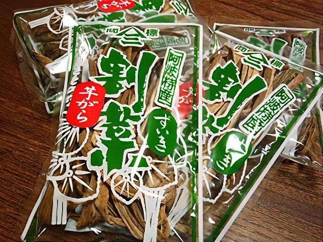 「芋がら縄」と言われる物があります。里芋の茎を干して作った芋がらを縄状に編んだ後、味噌で煮込んでから乾燥させた物です。