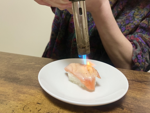 お店で注文しても、回転寿司のレーンで届くまでにややタイムラグがあるだろう。真の炙りたてサーモンは、家でしか食べられないのではないか。