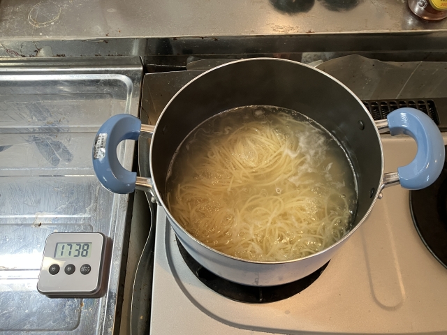 55分ゆでたパスタはきれいな円形にまとまっていて、パッと見、鍋に入れたてのインスタント麺のようにも見える。