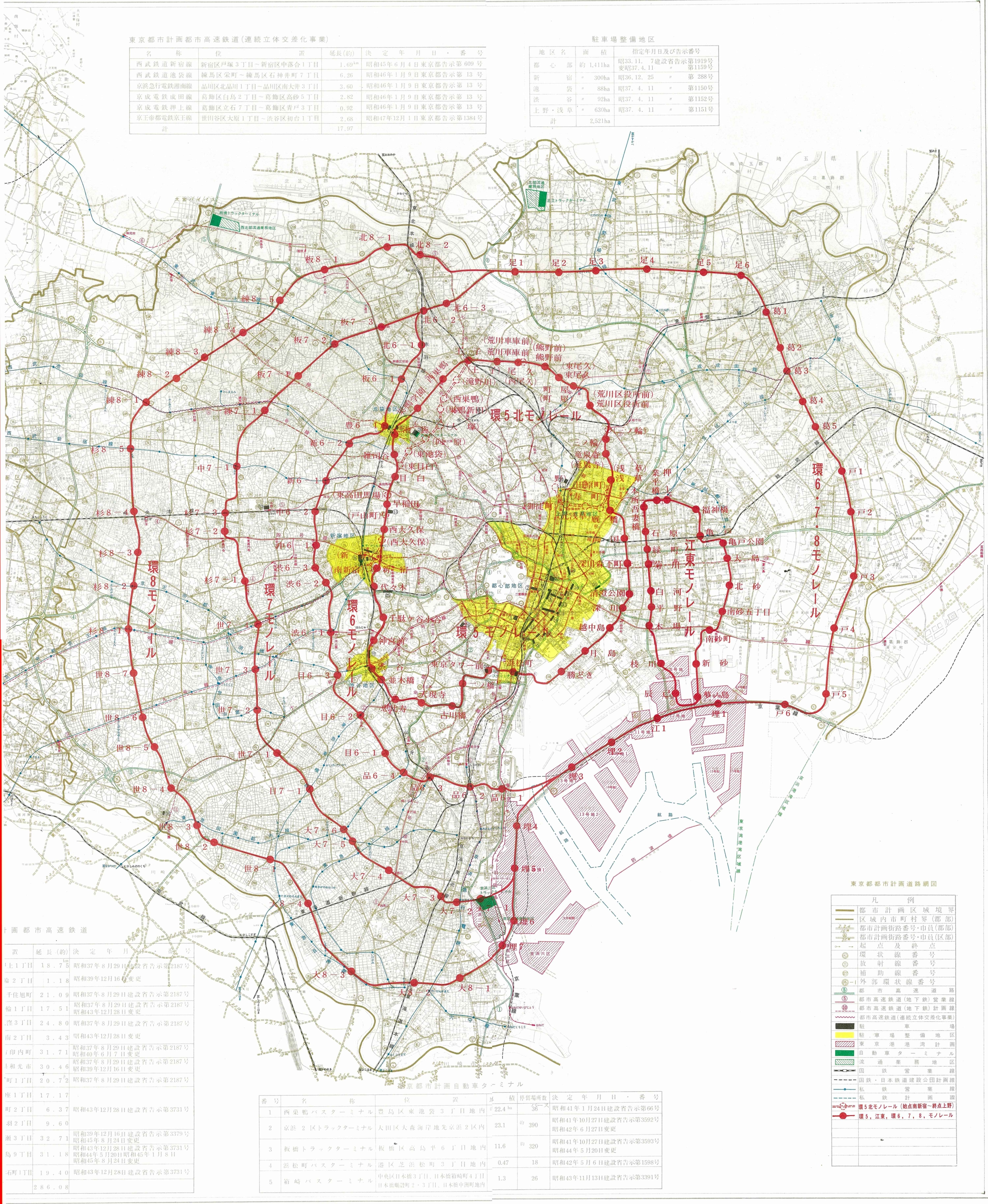 環八モノレールは、昭和46年(1971年)に計画、検討された。最初にも書いた通り、環状の東半分は環七でこれは変わらず、西半分は環八、環七、環六をそれぞれ通るルートが検討されている。
