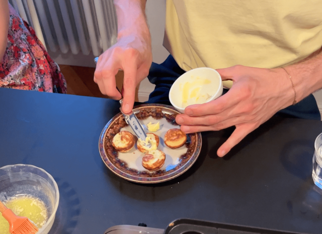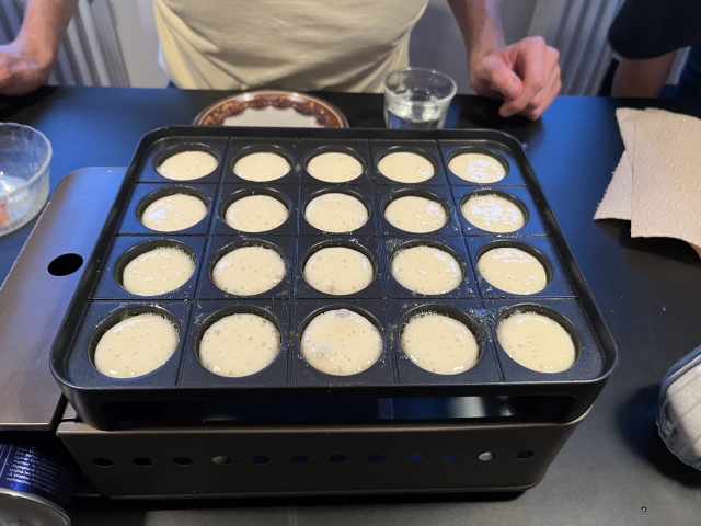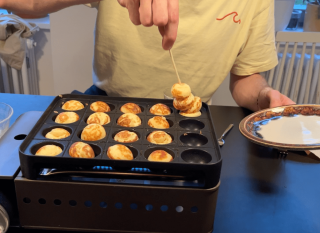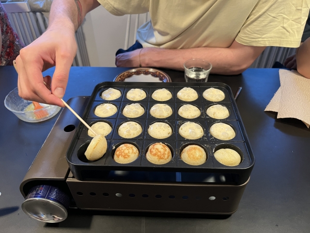 ヤニックにたこ焼き器を使った感想を聞いたところ、実際のポッフェルチェのサイズよりは若干小さめなものの、たこ焼き器は十分ポッフェルチェ器として使えるとのこと。
