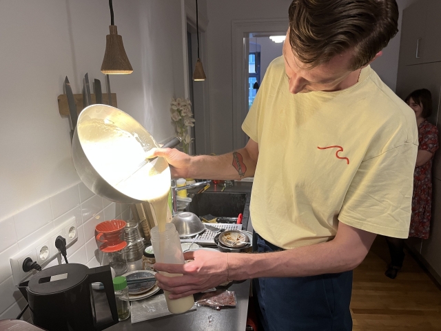 注ぎやすいように、生地をボトルに入れ替える。こういうのが家にある人はプロっぽい。