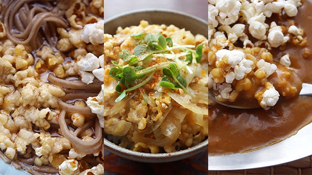 さて、ここまで実験してきてなんとなくパターンが読めてきました。ポップコーン、汁でびたびたにしてしまうと著しくパフォーマンスが落ちる。しかしながら、適度にしめらせつつ、独特の食感も残るようにアレンジすると、なかなか美味しい。