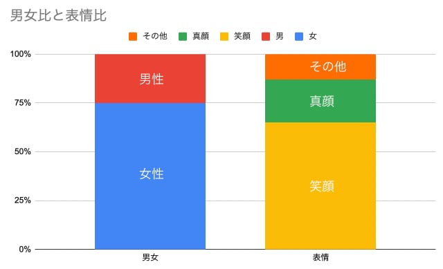 男女比は、女性が75%、男性が25%だった。表情の割合は、笑顔が65%、真顔が22%。うん、だいたい想像どおりだな。