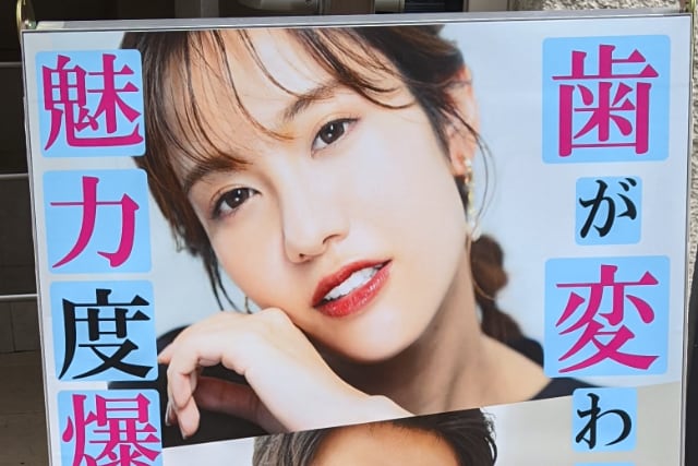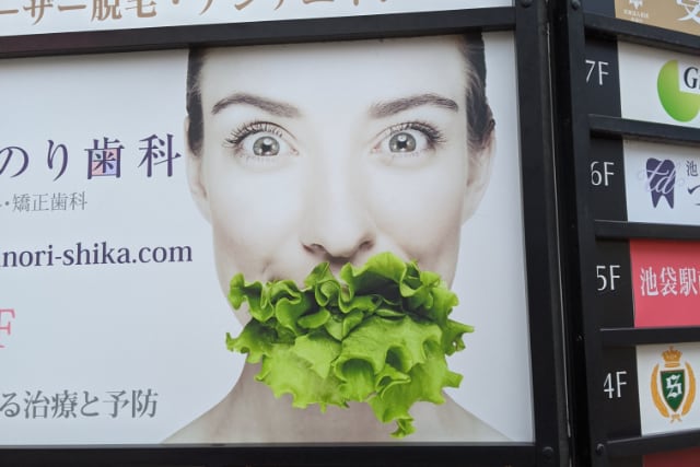 歯科のポスター。ポーズの意味がよく分からない。歯を健康にすると野菜もわしゃわしゃ食べられる、ということだったりするのか。
