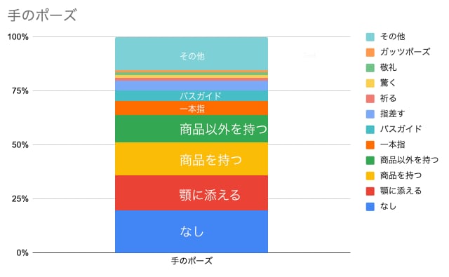 事前の想像では、ヤッホーのポーズのように、何かのメッセージを伝えるポーズが多いと思っていた。しかし実際には、「商品を持つ」という直球なポーズがそれらよりも多かった(15%)。