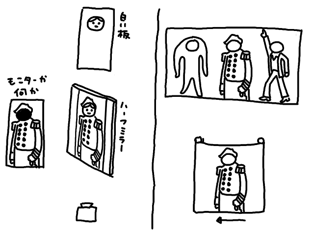 ハーフミラー(半分透けて、半分反射する鏡)を使ったらどうだろう。ハーフミラーで白い顔ハメと絵柄を合成するのだ。