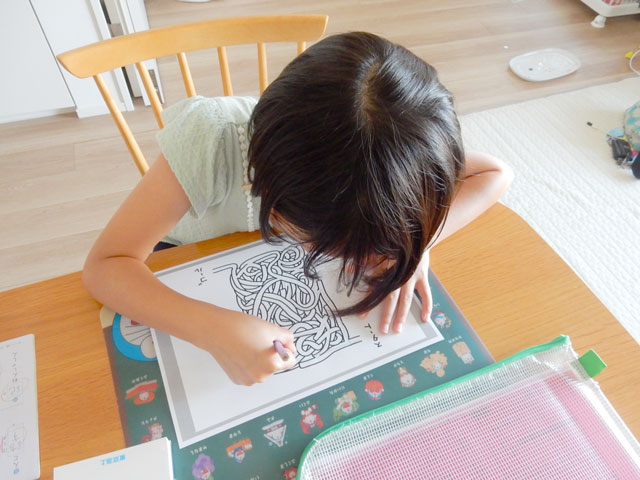 すごく苦戦していた。実はこの迷路、ルート自体は難しくないのだが、周りの麺と紛れているので道があるかどうかを見極めるのが難しい。子どもも、そこを脇道に入るのが正解、というところで見逃して、ほぼ全ての行き止まりにぶつかっていた。