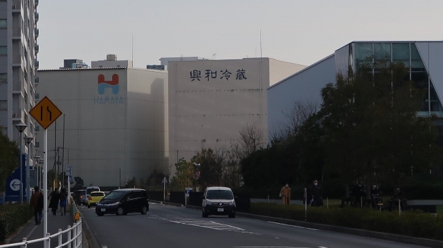 標識が案内する方にすこし歩くと、まず目に入ってくるのは「興和冷蔵」と書かれた大きな壁。