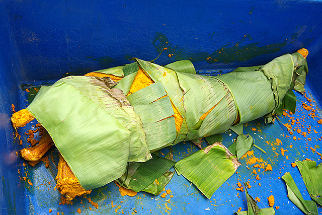 今回は全体にスパイスを塗り込んで、そのお腹に茹でた米を詰め込み、バナナの葉っぱで包んで焼くという方式が採用された。