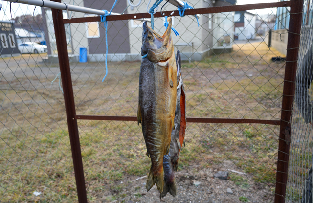 午前中は海に出ていた小野瀬さんを(おつかれさまです)午後にたずねた。庭の干し場にはあのサケがぶらさがっていた。