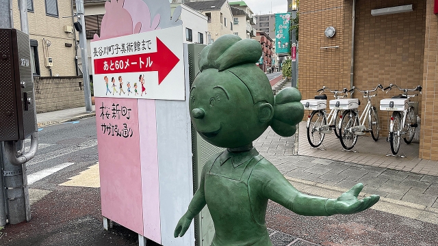 ここ桜新町の「サザエさん通り」にはいたるところにサザエさんのキャラクターがいて、まるでアニメのサザエさんが住んでいる「あさひが丘」を歩いているような気分になる。