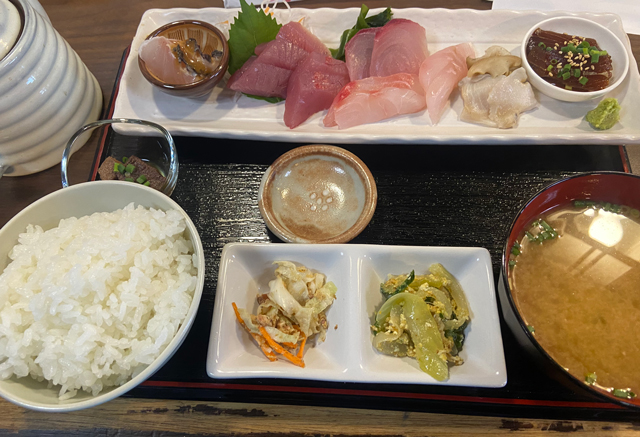 アオダイやシビなどとれたての地魚を使った刺身定食は絶品。写真は上定食ですが1000円の日替わりなんかでも満足度十分です。
