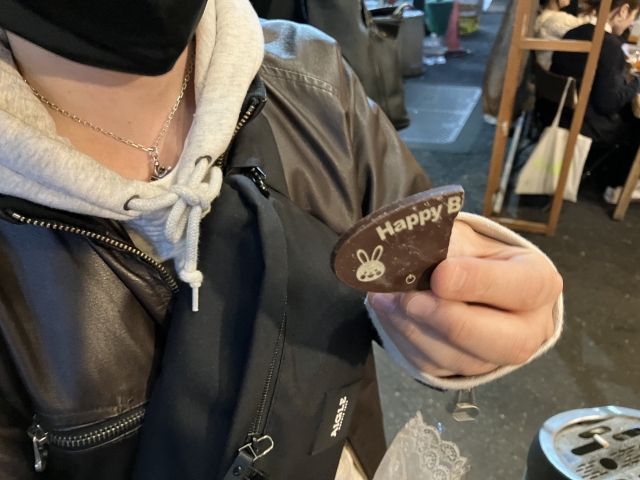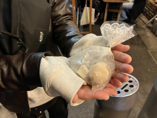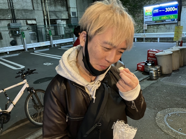 うまく渡すタイミングがつかめず、結果的に夜の新宿、それも喫煙所での贈呈となった。ファンシーなお菓子袋とはあまりにもミスマッチである。