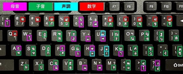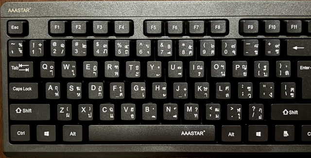 キーボードを見るまで知らなかったのだが、タイ語の文字体系にはタイ数字という数字もあるのだった。これにより、子音文字が42種、母音記号が19種、声調符号が4種、数字が10種で、合わせて75種類の字を表現する必要がある。