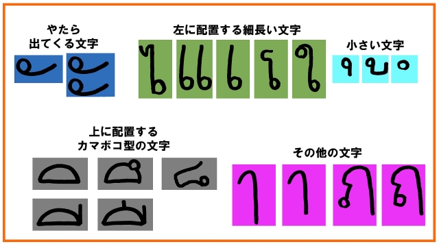 同様に、母音記号は形が似ているもの同士をグルーピングし、1つのキーに割り当てることで、計5個のキー割り当てで済むと予想。