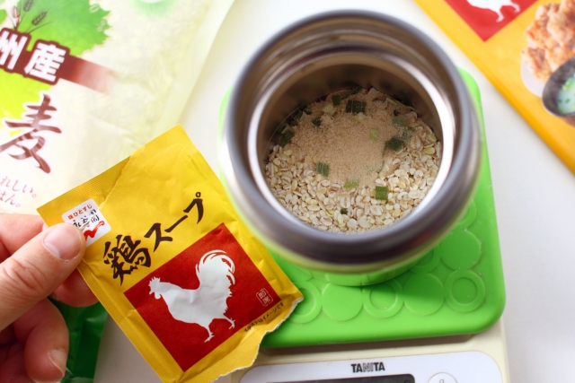 一方の押し麦。50gの押し麦に250mlの熱湯と味付け用にスープの素を入れます。何回か試した結果、これくらいの分量がちょうどいいということになりました。