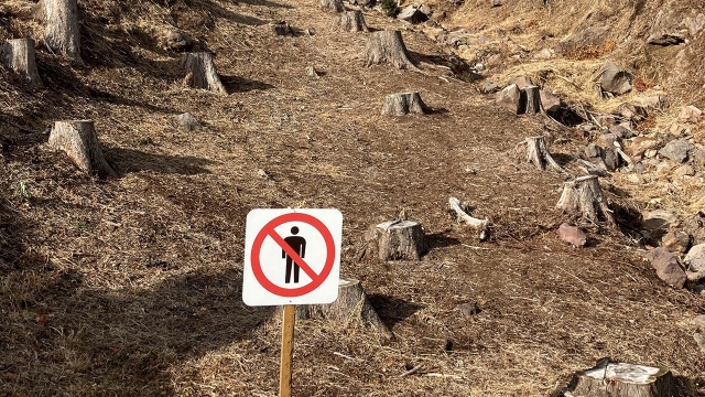 ここだけ切り取ると「有史以来最大の怪奇現象から100年、木々はなくなり、この地には未だ人間は立ち入り禁止のままである…」みたいな妄想をしてしまう。動物たちや景観を守るためではあるものの、ここまで切り株が密集してると迫力がある。