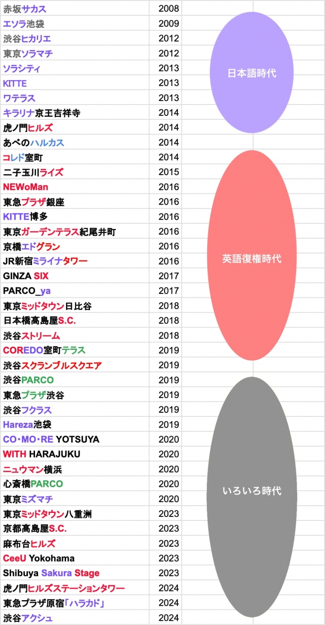 そこで商業施設名は時代ごとにどうだったのかをまとめた年表を作ったところ、こんなふうになった。