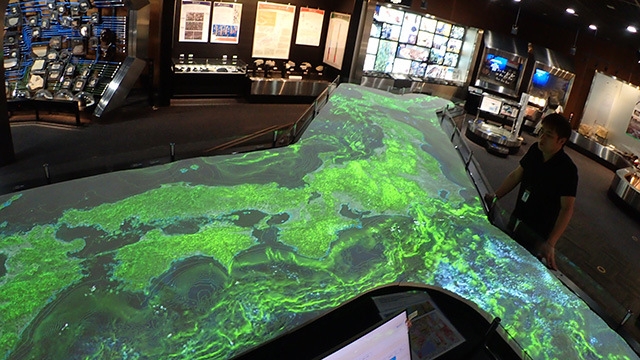 さらに目を見張るのは精緻な凹凸とそれに合わせた色付けだ。この日本地図は3Dデータをもとに凹凸が正確に再現されており、これに立体処理した画像を投影(プロジェクションマッピング)している。そんな地図、他にあるか。