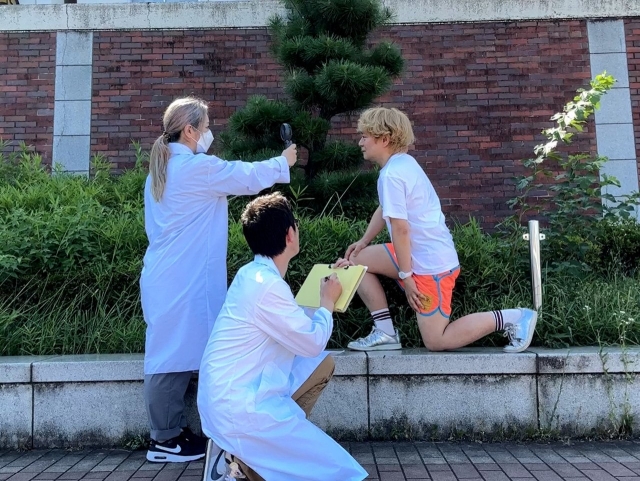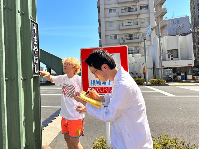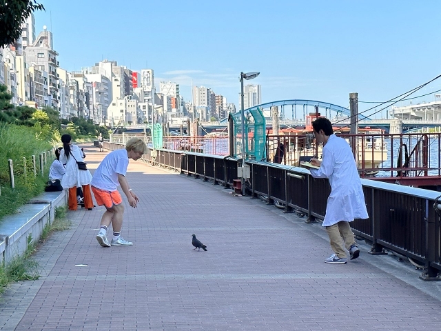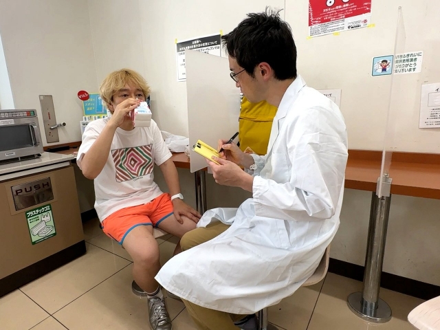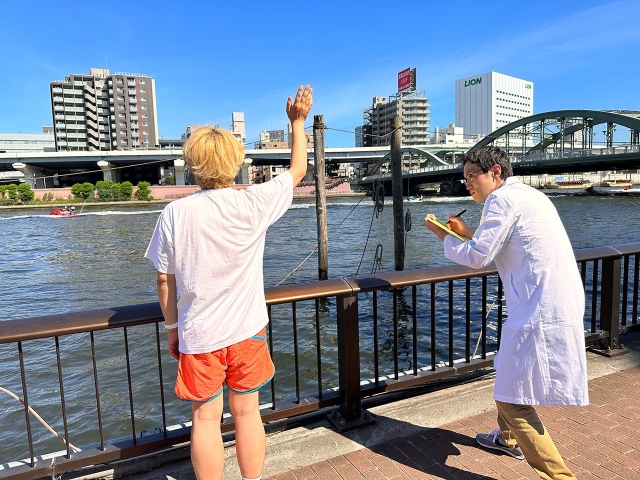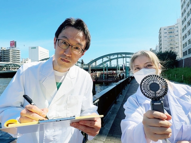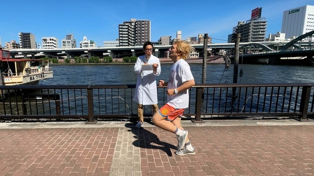 この日の東京は35℃。命をかけてまで撮影する内容ではないので屋内に入った。するとどうだろう。とたんに白衣が医者に見えてくる。科学トレーニングっぽさがなくなる。