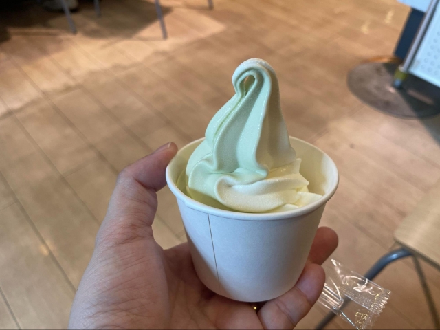 なめらかすぎないちょっとシャリっとしたソフトクリームです。マンゴーの味がすぐ来なくて意外でした。