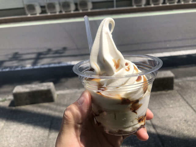 豆腐の食感があるのがおもしろくておいしい。やっぱりお豆腐屋さんの豆腐だからか、なめらかでツルンとしている。それが冷たいソフトクリームをまとっているのがとてもおいしい。黒蜜もくどくなくてさっぱりしていた。