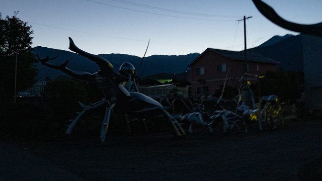 話は盛り上がって、帰る頃にはすっかり陽が落ち、大道さんの作品達は昼間とは違う荘厳な雰囲気で絶対印象を放っていた。そこに鳴き出した秋の虫達の声が重なって、少し驚き疲れた私の頭をますますわからなくしていた。