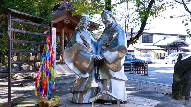 古くから安曇野では路傍の素朴な神、道祖神が数多く祀られてきた。この像は平成25年に長野県が全国一の長寿県となった記念に健康長寿道祖神として建立されたとの事。