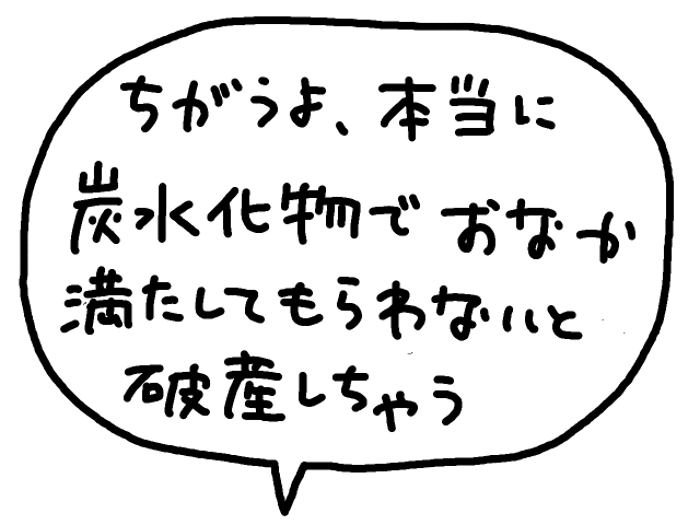 僕も炭水化物を食べないと満腹感が得られないので分かる。破産はよく聞こえなかったので違うかもしれない。