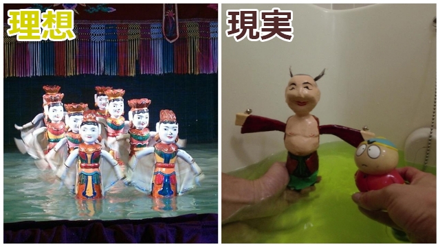 それはベトナムの伝統芸能。外国人旅行者にも人気だが、セリフはオールベトナム語。だが伝統芸能なので問題なし。以前なんとなく土産に買った人形がうちに転がっていたので、人形劇やってみた。舞台は家の「お風呂場」だ。
