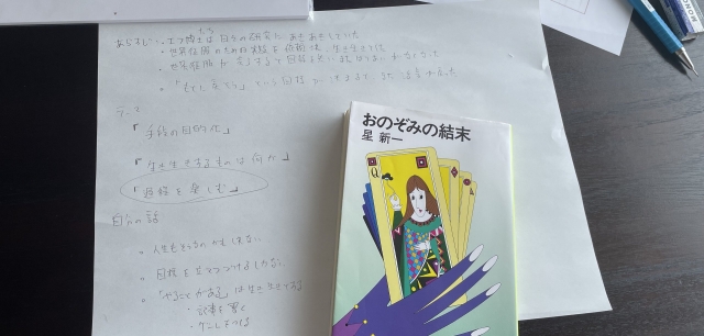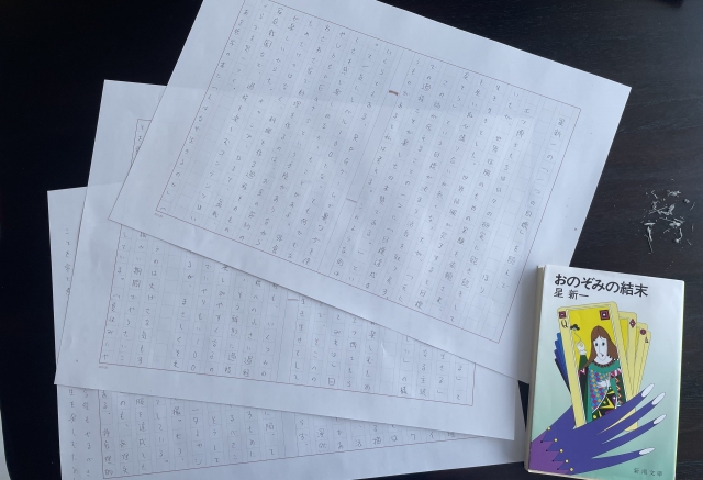 まずは本選び。これには作戦があって星新一のショートショートから選ぶことにした。星新一は小5のころから大好きで、学級文庫に置いてある「おーい でてこーい」「ボッコちゃん」などの短編集をよく読んでいた。今回は「おのぞみの結末」という短編集を購入し、事前に読んで感想の書きやすそうな「一つの目標」というストーリーに目を付けていた。