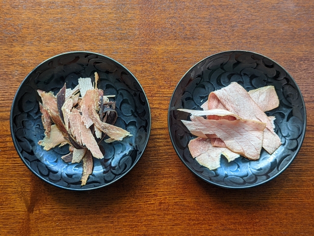 カツオは醤油、マグロは塩で味付けした後に燻してあるみたい。