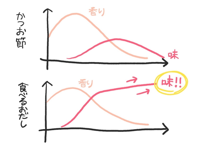香りはカツオ節に似ているが、ふつうの普通のカツオ節よりも燻製香が強い感じがする。更にカツオ節よりもフレッシュな魚介の香りが合わさって食欲をそそる。