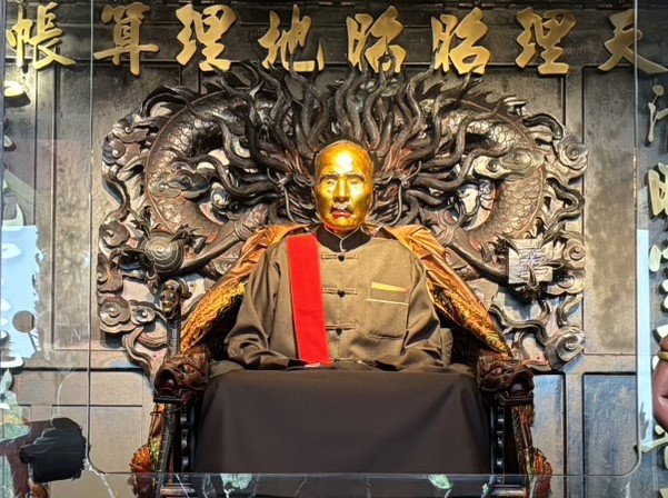 蔣介石はかつて台湾の地で権威をふるった総統です。ステッキを持ってさわやかにたたずむ彼が廟の中にいます。