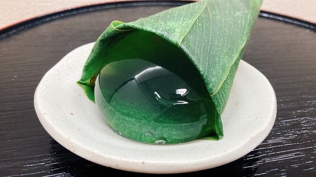 この二つで水滴っぽいゼリーを作る。それを葉っぱでくるむ。