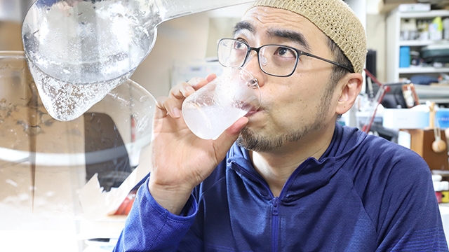 ここに炭酸水を注ぎ、ゲル化剤を少量の水で溶いたものを加える。あとはポンピングして内圧を高めてから菜箸で攪拌したら、とろみ炭酸水が完成だ!