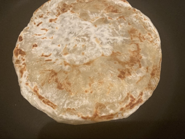 裏が透けるほど薄いので火の通りは抜群に早い。すぐにぷっくり膨らみ始める。電子レンジ20秒でもOK