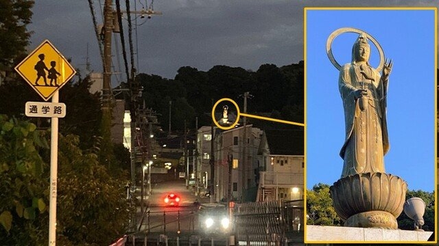 西日に向かってたたずむ観音様の像。足元にライトが見える。これで夜でも後光を指しながら戸塚の街を見下ろしていたのだ。